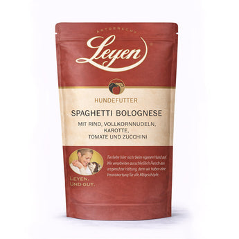 Wenn Ihr Hund mal einen doofen Tag hat, weil nix funktioniert hat oder das Wetter so ist, dass man keinen Hund vor die Tür jagen möchte - dann können Sie ihn mit unseren Spaghetti Bolognese gleich wieder vom Ofen hervorjagen! Hunde lieben Nudeln, und Vollkornnudeln sind ein hervorragender Energieträger und sind gleichzeitig leichtverdaulich, und die leichte Tomatensauce mit Rindfleisch bringt ihn schnell wieder zum Wedeln.