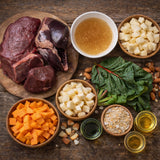 45,1 % Rind (22,1 % Muskelfleisch, 20,4 % Herz, 2,6 % Leber), 17 % Kochbrühe, 17 % Süßkartoffel, 8,5 % Pastinake, 6,4 % Hirseflocken, 4,3 % Mangold, Mandeln, Leinöl, Hanföl und Eierschalen